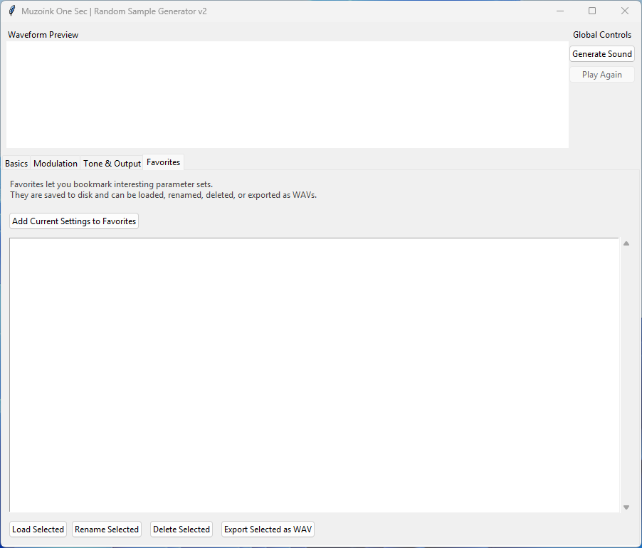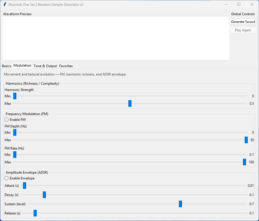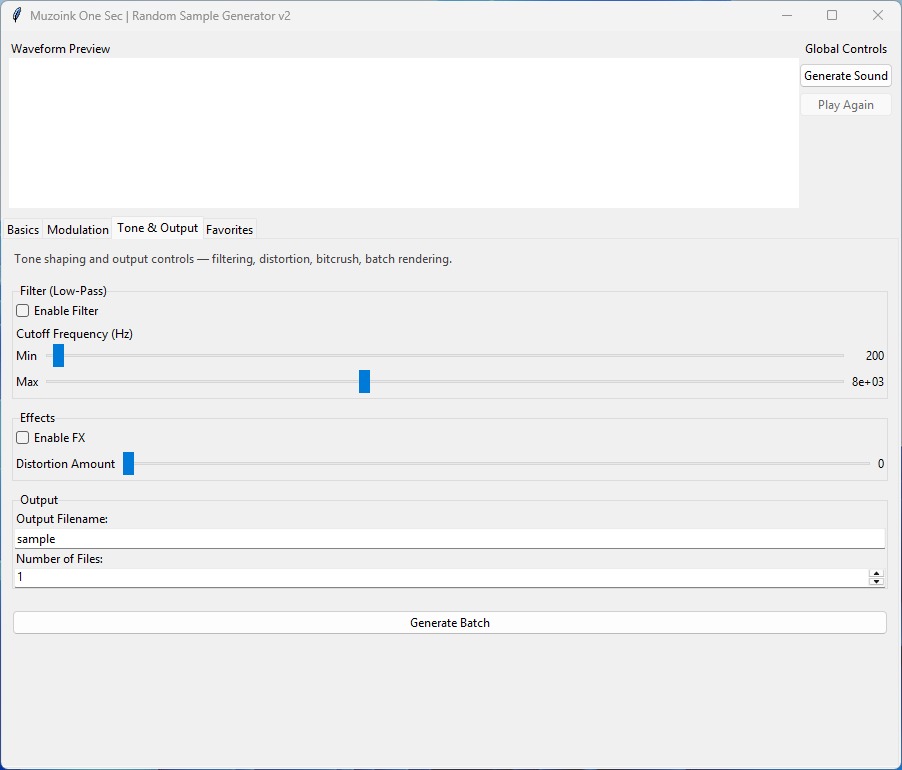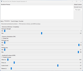 The application combines oscillator controls, modulation options, filtering, distortion, and envelope shaping within a unified interface. Each sound is generated by selecting values within user-defined ranges, allowing the tool to produce diverse results while retaining consistent structural boundaries. Users may preview sounds, export batches of files, and save preferred parameter sets for later use. The system is intended for rapid sound design, experimentation, and the creation of audio assets suitable for music production, interactive media, and general creative applications.