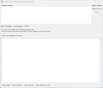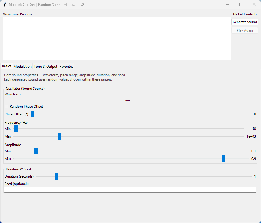 One Sec! Mega, version 2, is a randomized audio sample generator designed to create short, varied sound fragments through configurable synthesis parameters.